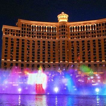 ベラージオホテルは、音楽と照明に合わせて高く舞い上がる水のショーがとても美しいです。イタリアの避暑地ベッラージョが面する「コモ湖」をモデルとした人工湖で行われます 1.000を超える噴射口から放たれる水飛沫が、クラッシクやオペラ、歌舞伎の曲や、リズムに合わせ、光を纏いながら舞うように踊ります。訪れた人々は何時間も見とれています。